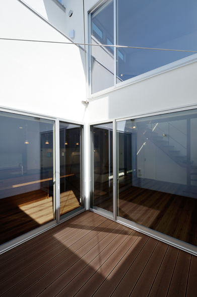 プライベートヤードをもっとも条件の良い場所に配置し、吹き抜けにより自然光を最大限建物内に取り込みます。その空間から中庭を望むと自分だけが見える空が感じられるデザインとなる。