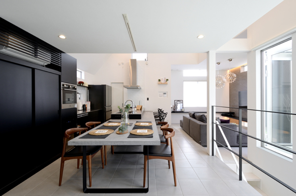 LDKは壁のない一つの空間。リビングは床にあえて段差をつけたスキップフロアーが、吹抜をさらに解放感を持たせた大空間。キッチンは勾配天井に設けた高窓から積極的に取り入れた自然光が感じられる空間。ダイニングは落ち着きのあるフラット天井、その一部に自然光がこもれる空間。